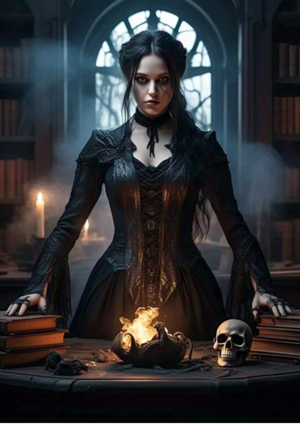 Gothic witch T-shirt chest piece. highly detailed, print ready.